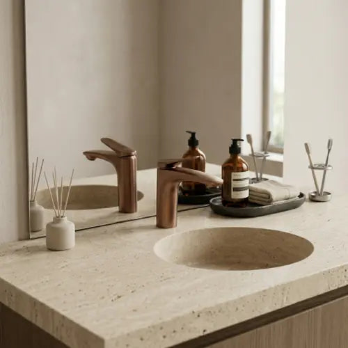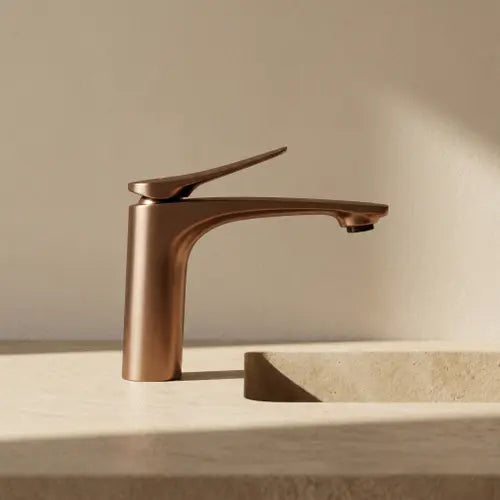 Bateria umywalkowa Vision premium w wykończeniu szczotkowanej miedzi to propozycja dla osób, które chcą wyróżnić swoją łazienkę niebanalnym designem i ciepłą, elegancką kolorystyką. Subtelnie matowa powierzchnia oraz dopracowana forma sprawiają, że model ten przyciąga uwagę i nadaje wnętrzu indywidualnego charakteru.