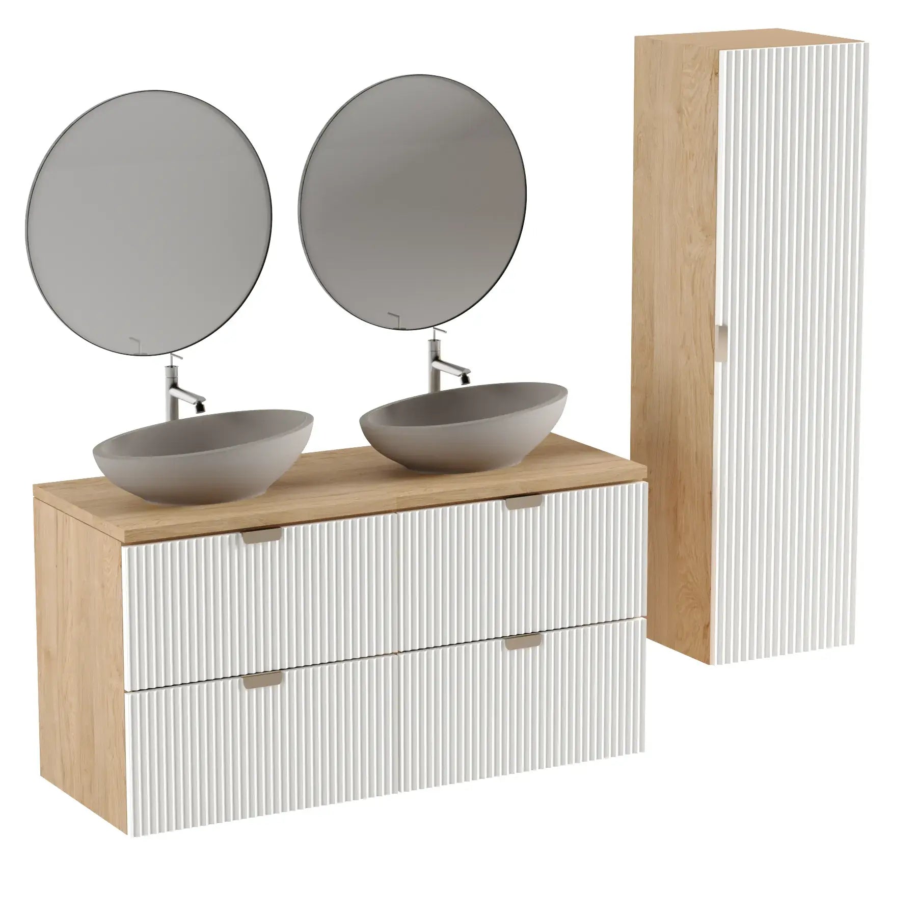 Słupek łazienkowy Biały / Orzech 120 cm Willy to doskonałe rozwiązanie dla osób, które szukają eleganckiego i funkcjonalnego mebla do swojej łazienki. Wyjątkowe ryflowane fronty w białym lub orzechowym wykończeniu nadają meblowi nowoczesny i stylowy wygląd, który świetnie wpasuje się w różnorodne aranżacje – od minimalistycznych po klasyczne wnętrza.