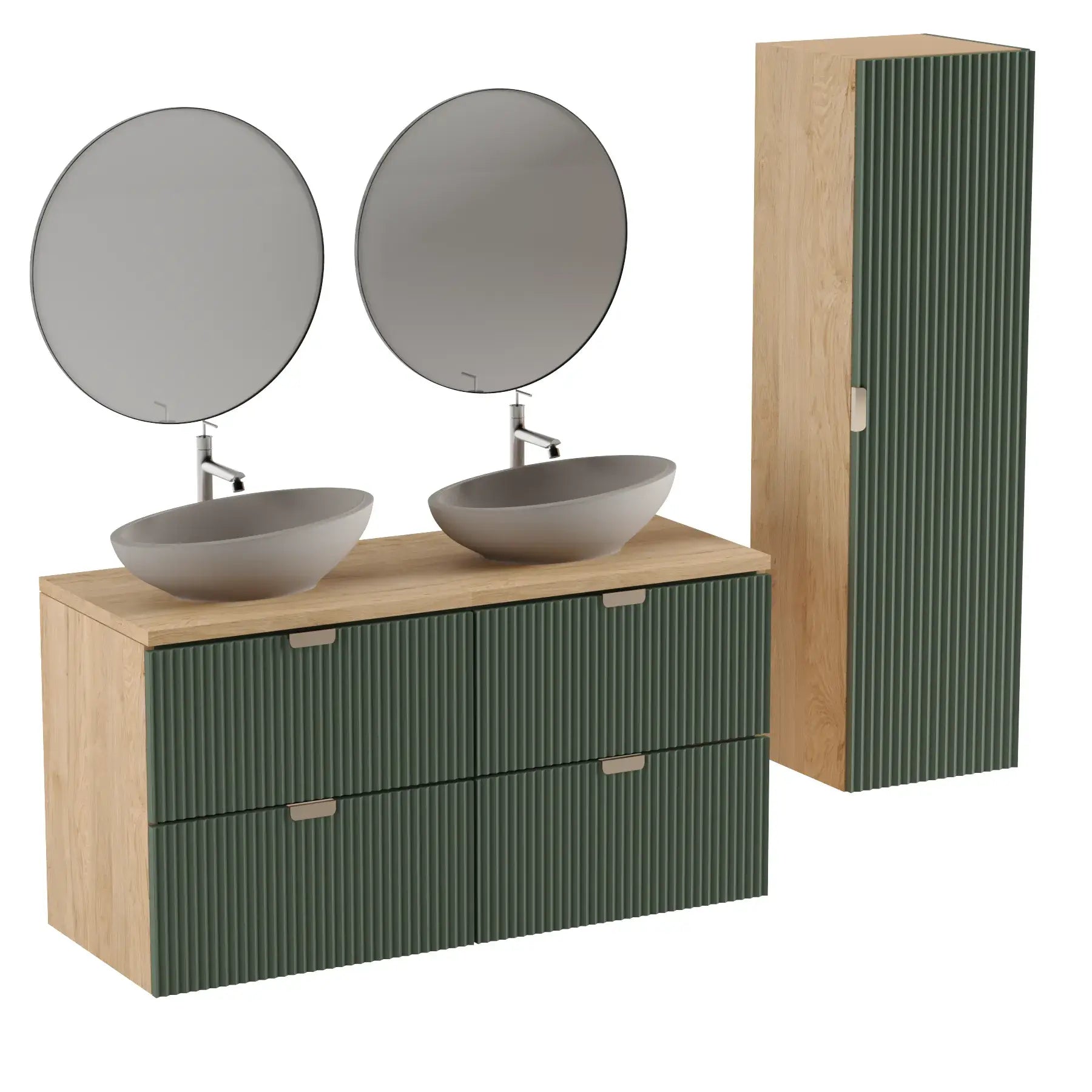 Słupek łazienkowy Szałwiowy / Orzech 120 cm Willy to wyjątkowy mebel łączący szałwiowy kolor frontów z orzechowym wykończeniem, co nadaje mu elegancki i nowoczesny charakter. Ryflowane fronty w subtelnym odcieniu zieleni doskonale kontrastują z naturalnym odcieniem orzecha, tworząc harmonijną kompozycję, która wprowadzi do Twojej łazienki styl i klasę. Całość uzupełniają solidne metalowe uchwyty, które dodają meblowi nowoczesnego wyrazu i trwałości.