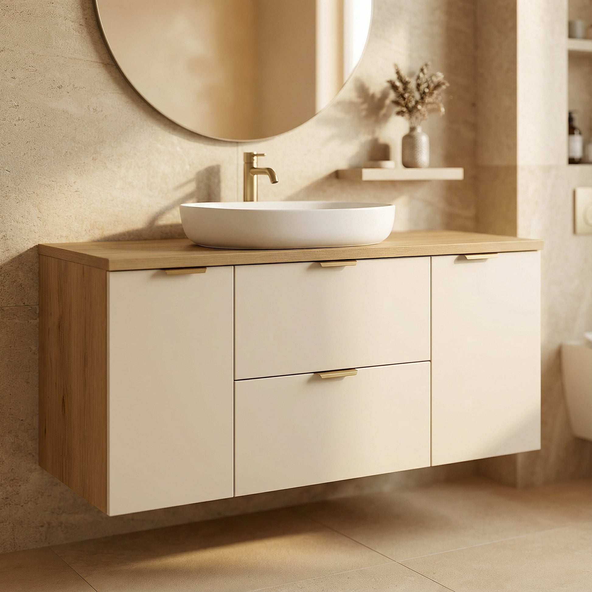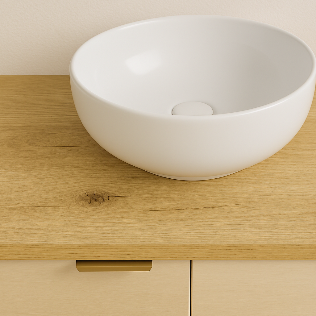 - Kolor Kaszmir/Dąb Artisan – eleganckie połączenie kaszmirowego odcienia z naturalnym dębem artisan, które tworzy przytulną, ale nowoczesną atmosferę w łazience.