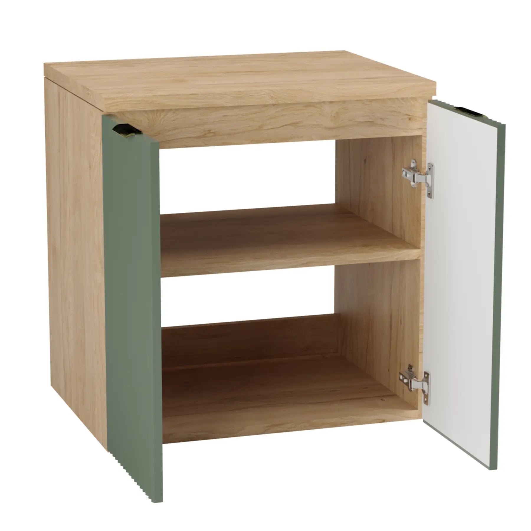 Szafka łazienkowa Willy 60 cm w wyjątkowym zestawieniu kolorystycznym – szałwiowy front z dekoracyjnym ryflowaniem i ciepły korpus w odcieniu orzecha – to mebel, który doda łazience stylu i charakteru. Naturalne wykończenie świetnie wpisuje się w modne aranżacje.