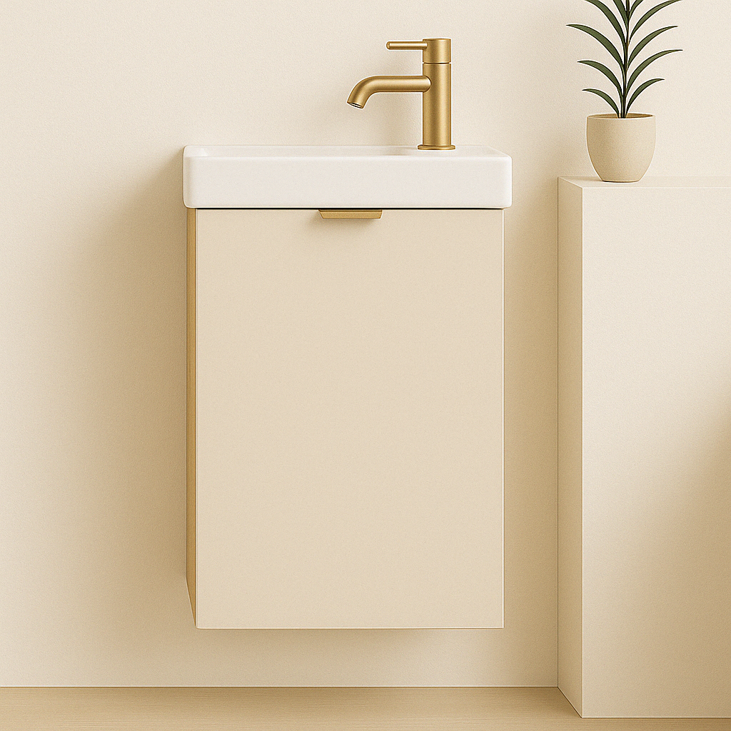 Szafka łazienkowa z umywalką 40 cm Kaszmir Orio to doskonałe rozwiązanie do nowoczesnych, kompaktowych wnętrz. Jej subtelny, kaszmirowy kolor wprowadza do łazienki elegancję i spokój, tworząc harmonijną przestrzeń sprzyjającą relaksowi. Minimalistyczna forma, gładki front oraz złoty uchwyt czynią z niej stylowy i praktyczny element wyposażenia małej łazienki.