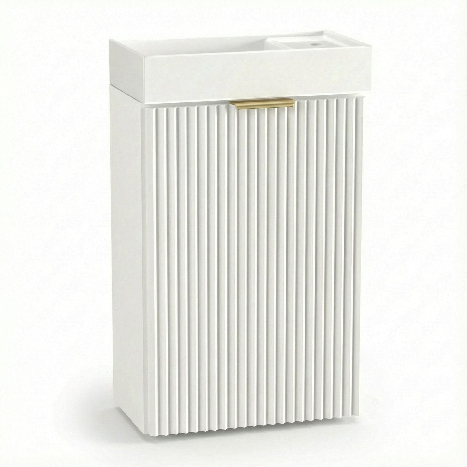 Szafka łazienkowa z umywalką 40 cm Biała Willy to doskonałe połączenie elegancji, funkcjonalności i oszczędności miejsca. Biały kolor szafki wprowadza do łazienki czystość, jasność i świeżość, idealnie komponując się z różnymi stylami aranżacyjnymi. Ryflowane drzwi nadają jej subtelną fakturę, która podkreśla nowoczesny charakter mebla, a metalowy złoty uchwyt stanowi elegancki detal, dodając całości wyrafinowanego akcentu.