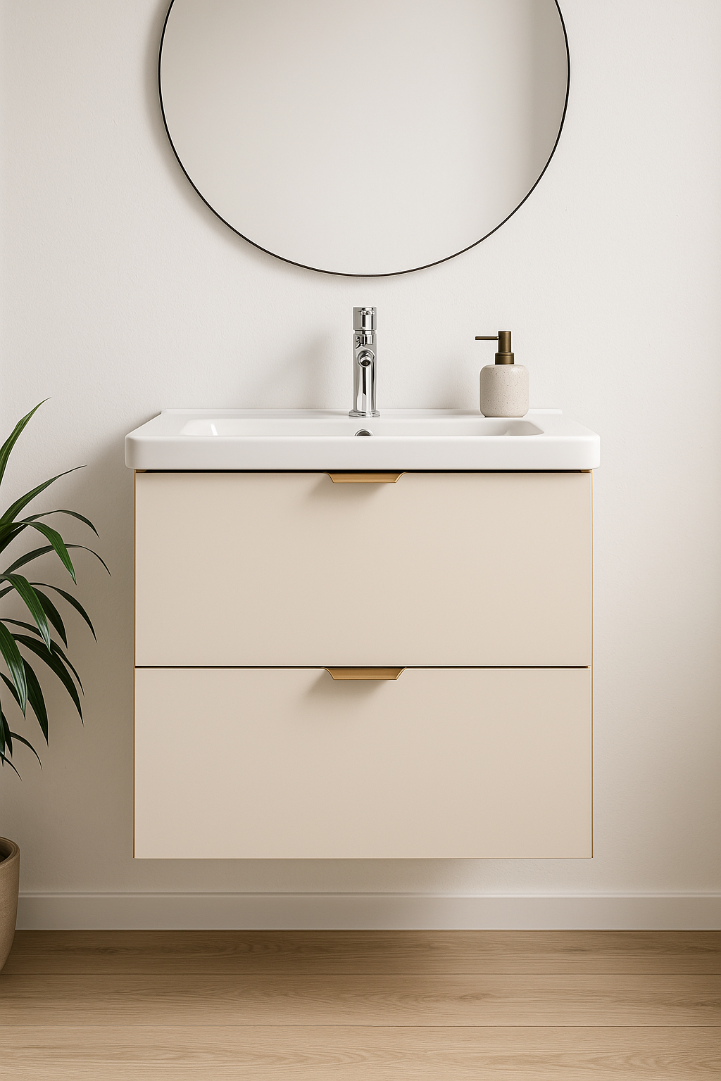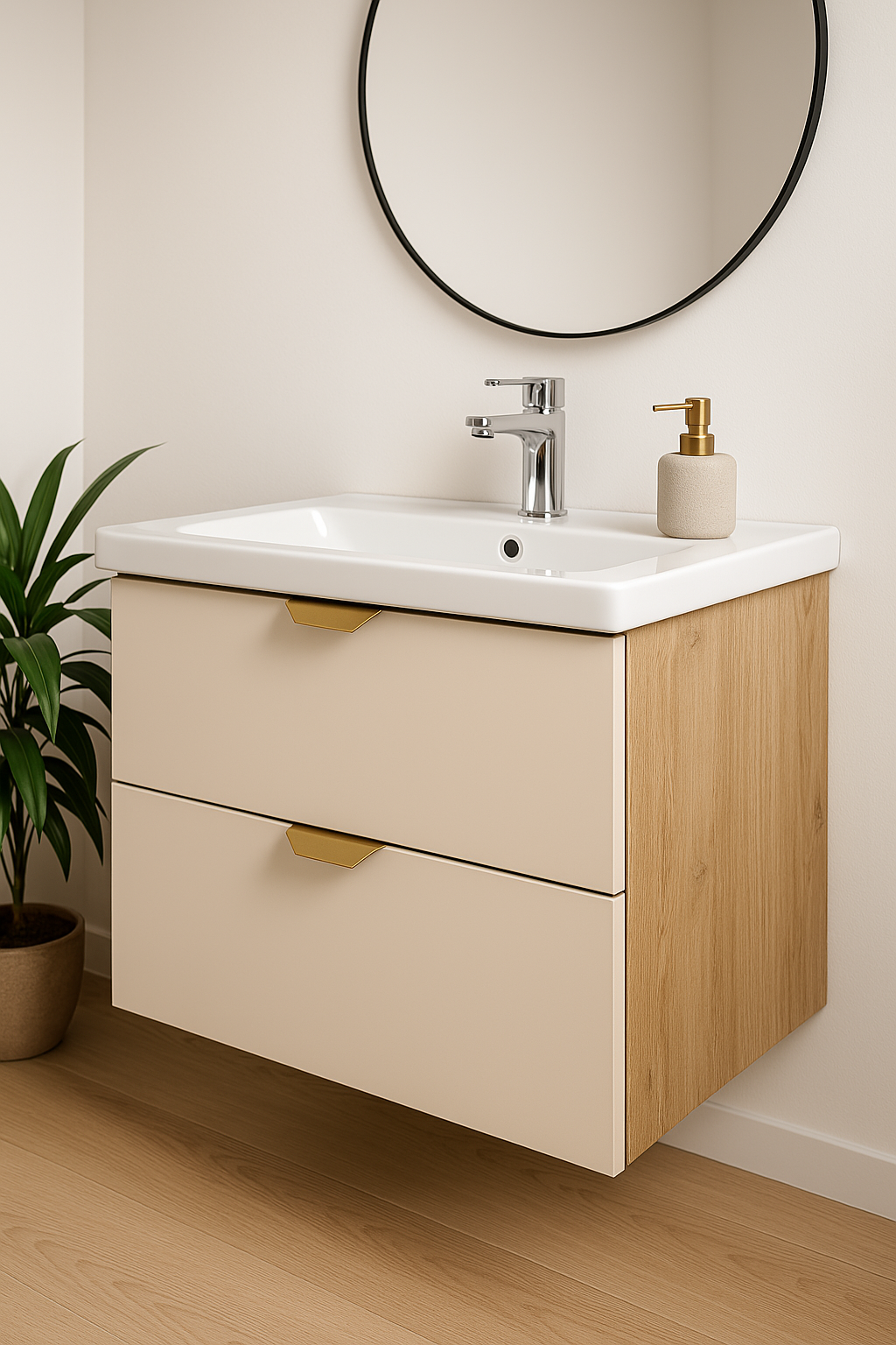 Szafka łazienkowa z umywalką 60 cm Kaszmir/Dąb Artisan Orio to doskonała propozycja do nowoczesnych łazienek , która łączy subtelną elegancję z funkcjonalnością. Połączenie kaszmirowego koloru z naturalnym dębem artisan tworzy przytulną, ale zarazem stylową atmosferę. Proste fronty szafki podkreślają minimalistyczny design, który idealnie wpisuje się w aktualne trendy aranżacyjne.