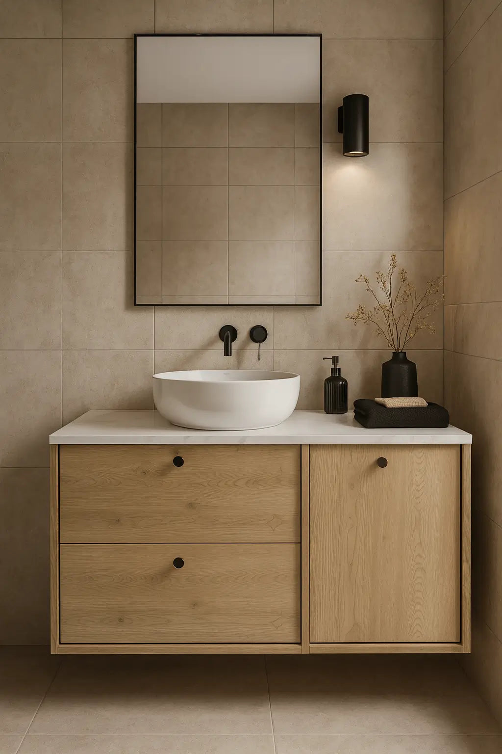 Mebel wykonany jest z płyty wiórowej laminowanej 18 mm, gwarantującej trwałość i odporność na wilgoć. Gładkie fronty i fronty cofnięte względem korpusu nadają całości minimalistyczny, nowoczesny wygląd. Szuflady z systemem Soft-Close zapewniają ciche i wygodne domykanie, a kosz na pranie w praktyczny sposób ukrywa odzież, zachowując porządek w łazience.