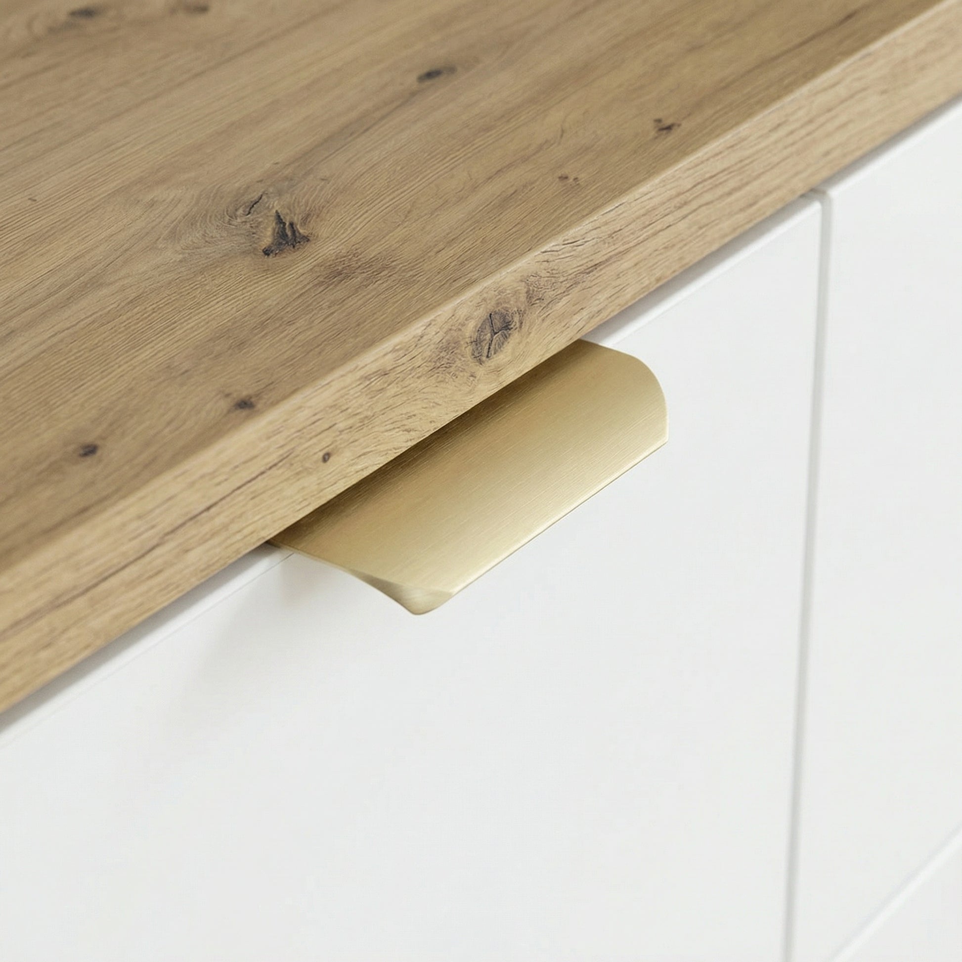 Połączenie gładkich, białych frontów z dekoracją Dąb artisan tworzy harmonijną, ponadczasową zabudowę, idealną zarówno do wnętrz nowoczesnych, jak i klasycznych.