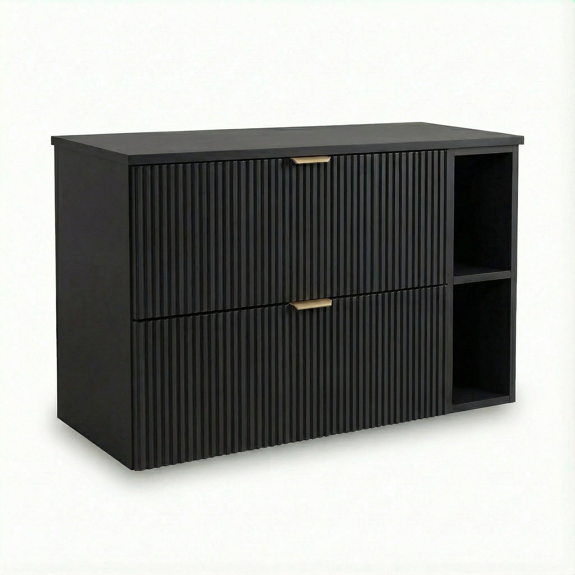 Szafka pod umywalkę 100 cm Czarny Willy to doskonałe połączenie funkcjonalności i ponadczasowego stylu. Charakteryzuje się eleganckimi, ryflowanymi frontami, które dodają jej nowoczesnego i subtelnie luksusowego charakteru. Ponadczasowy kolor czarny doskonale komponuje się w różnych aranżacjach, wprowadzając do łazienki elegancję i wyrafinowanie.