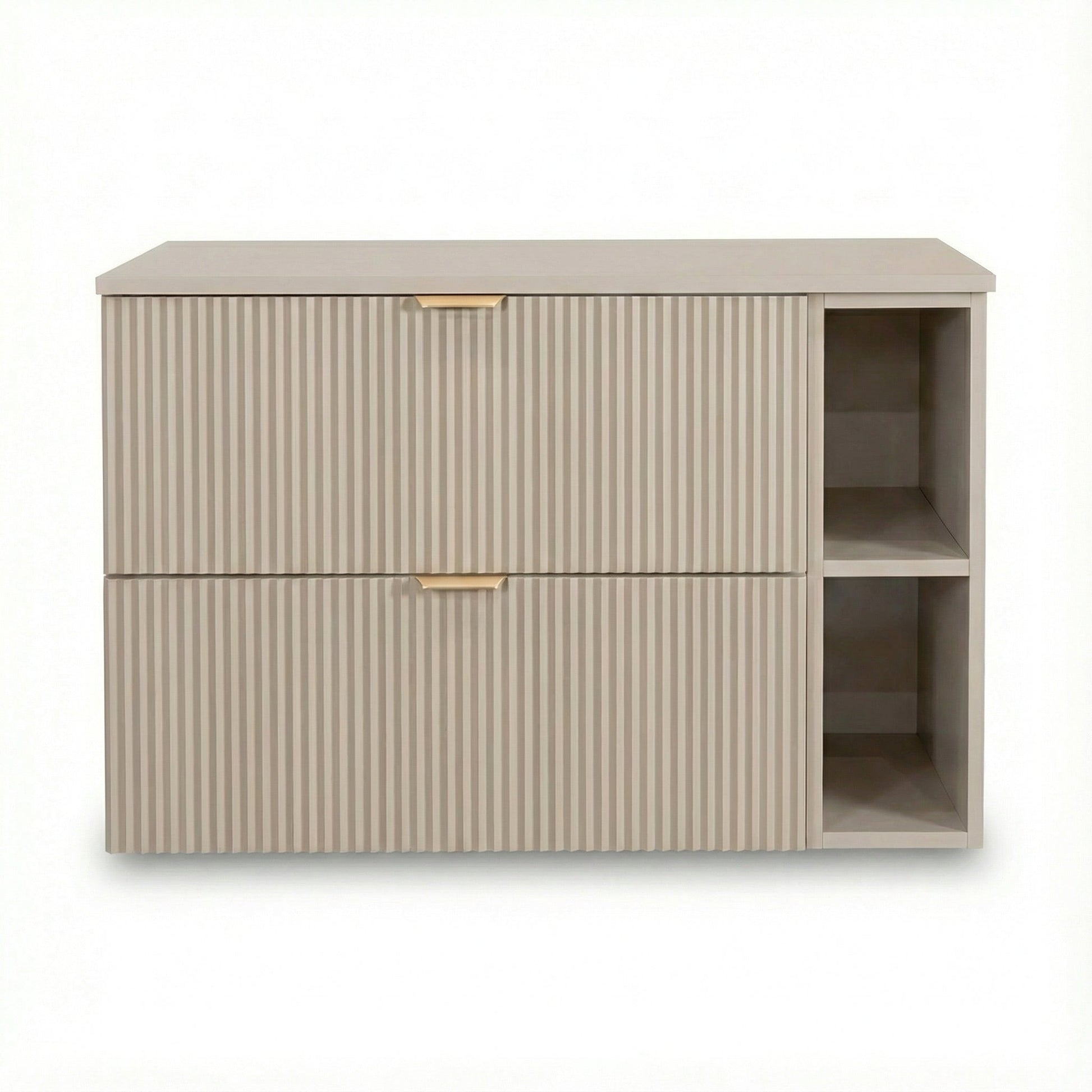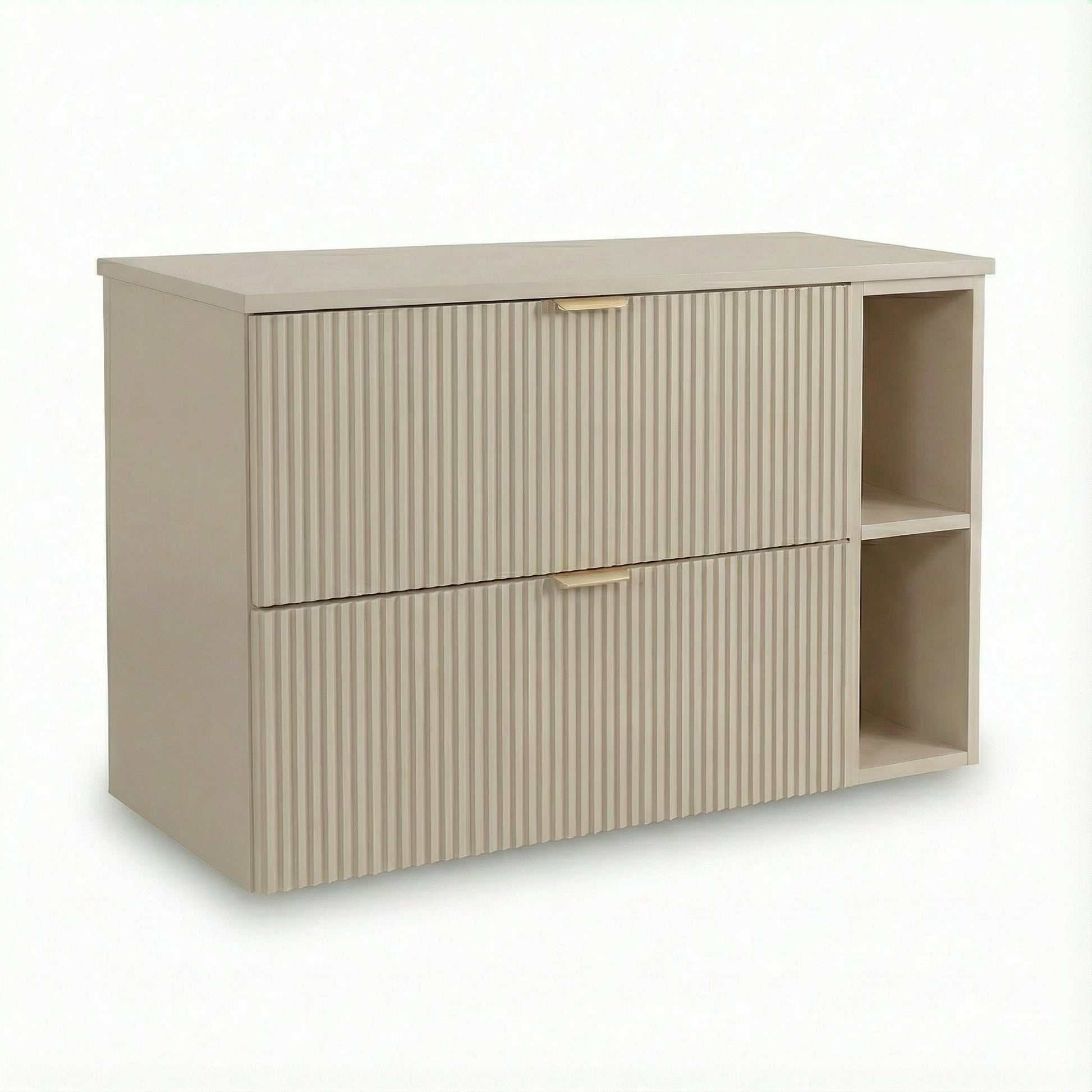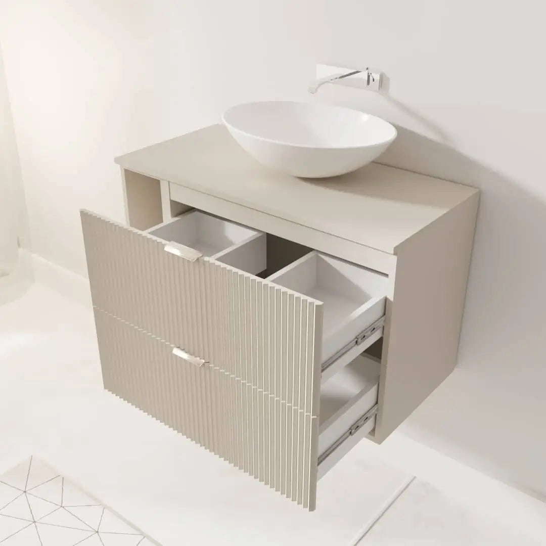 Szafka pod umywalkę 100 cm Kaszmir Willy to stylowe rozwiązanie, które łączy estetykę z praktycznością. Wyróżniają ją ryflowane fronty w eleganckim kolorze kaszmir, które nadają meblowi nowoczesny i luksusowy wygląd. Szafka została zaprojektowana z myślą o wygodzie użytkowania, oferując pojemne szuflady i funkcjonalny regał, które pomogą zachować porządek w łazience.