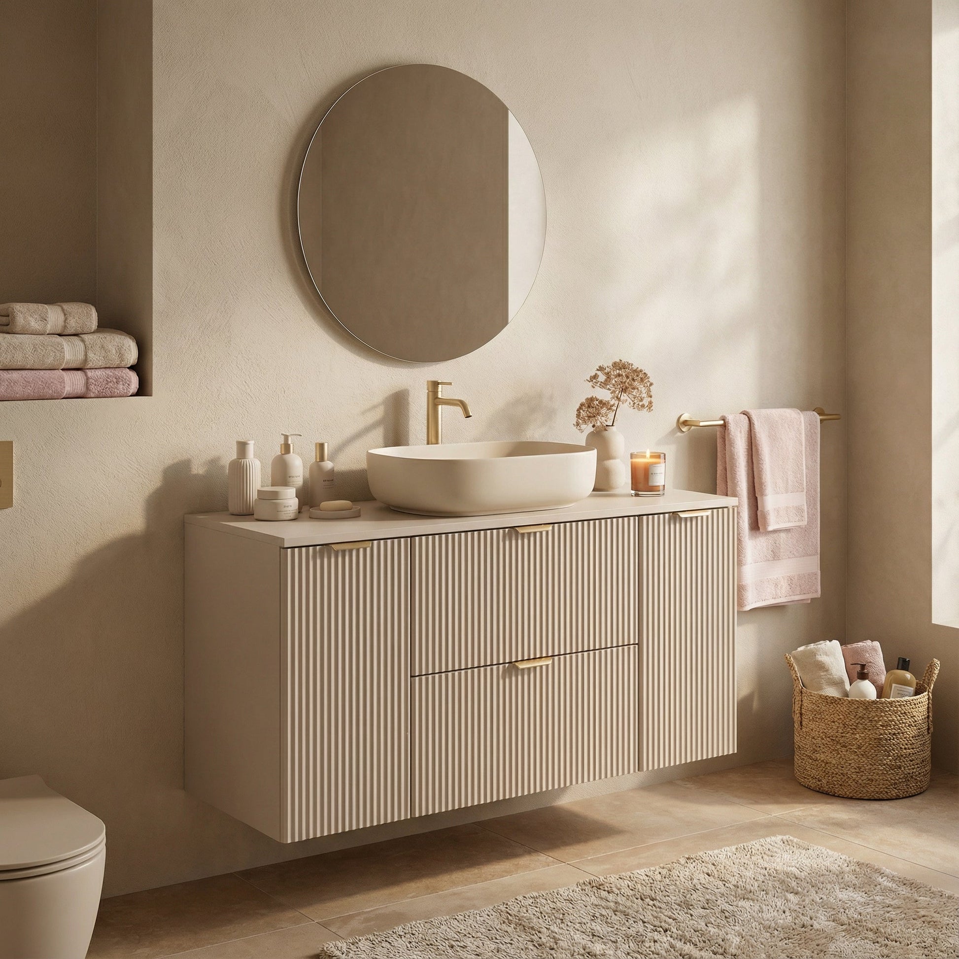 Szafka pod umywalkę 120 cm Kaszmir Willy to mebel, który łączy elegancki design z funkcjonalnością, doskonale pasujący do nowoczesnych łazienek. Wykonana w subtelnym, ciepłym odcieniu kaszmiru, szafka wprowadza do wnętrza przytulność i harmonię, tworząc elegancką atmosferę. Ryflowane fronty dodają szafce oryginalności, a złote metalowe uchwyty stanowią elegancki akcent, który podkreśla jej wyjątkowy charakter.