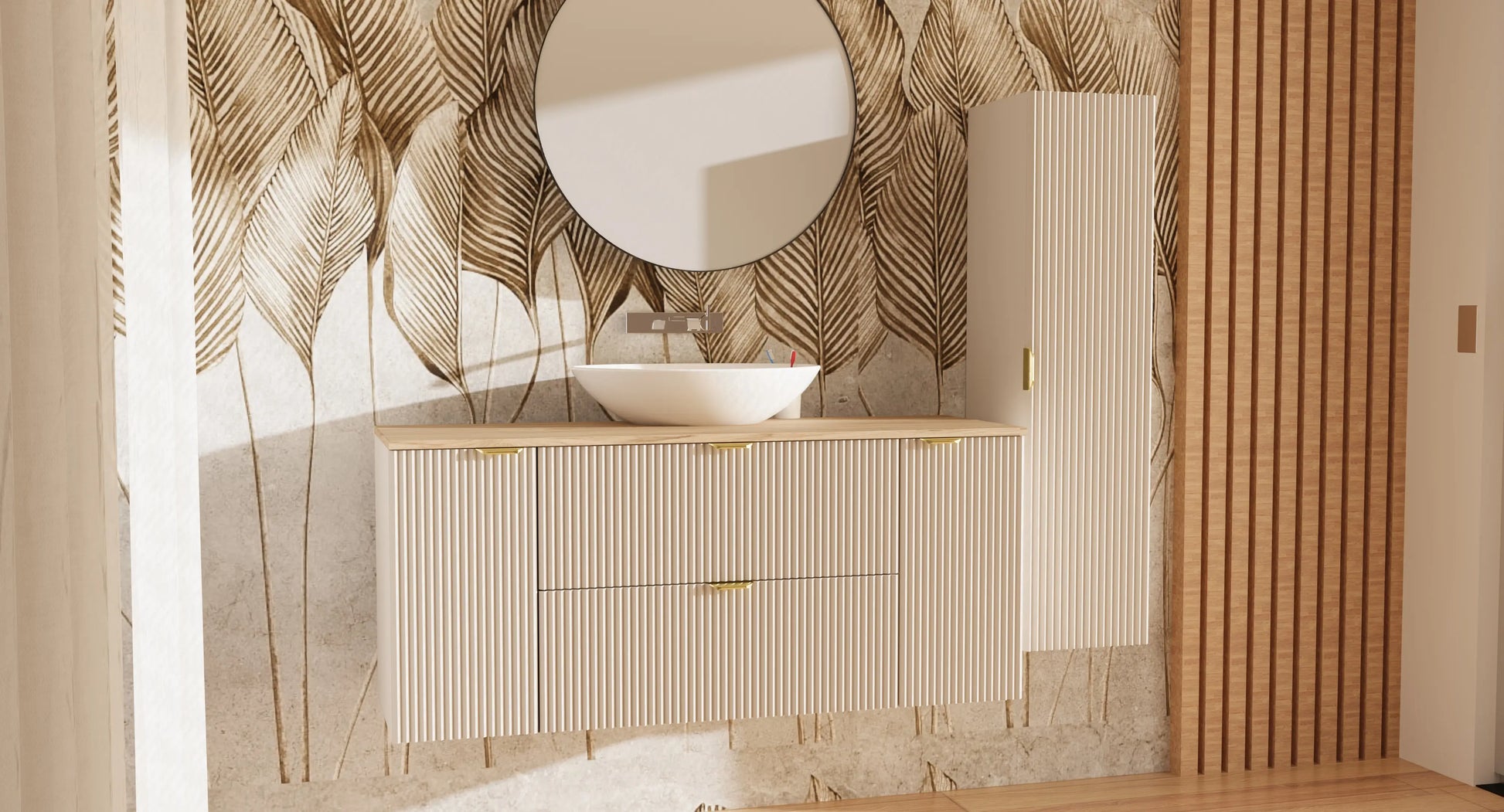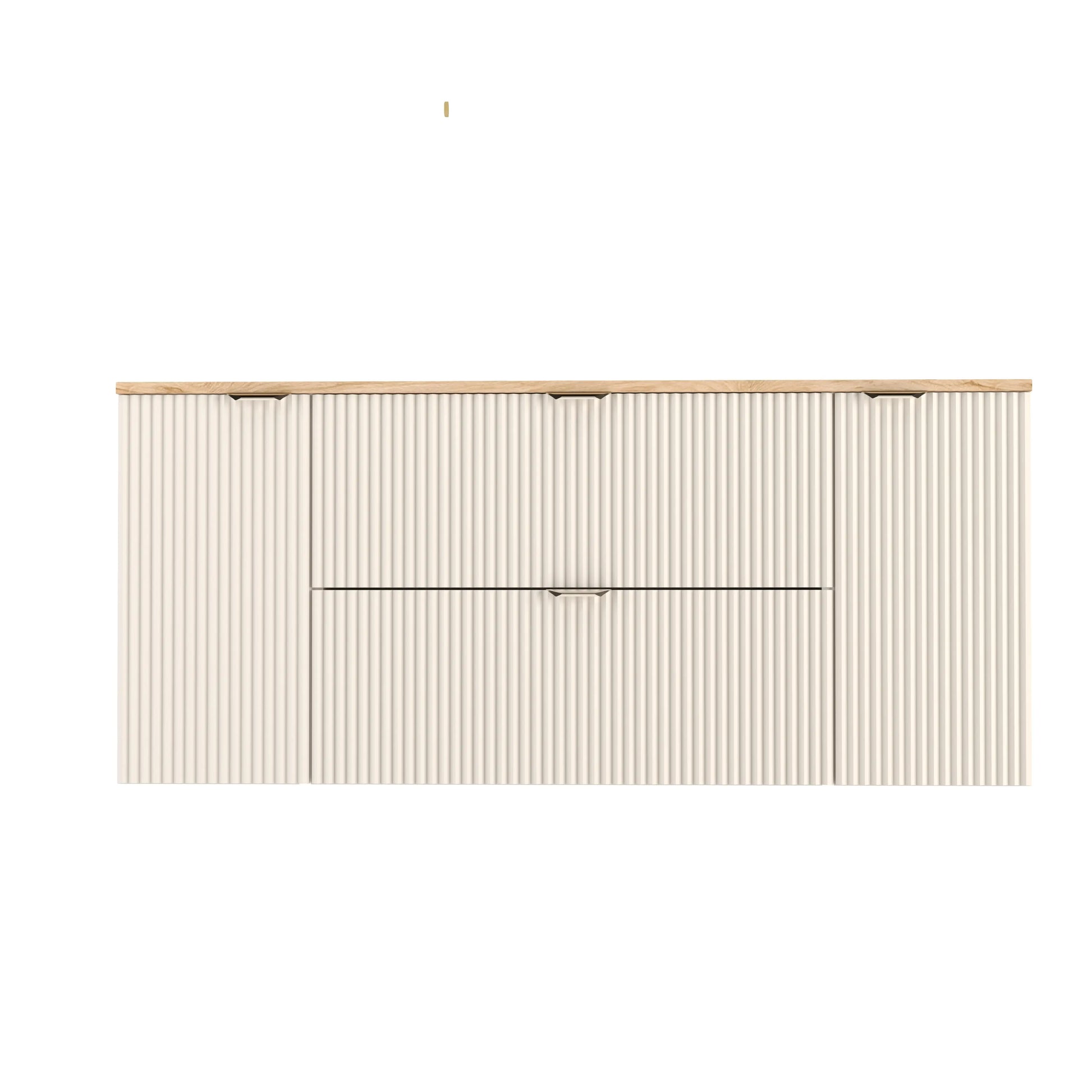 Szafka Willy zachwyca subtelnymi, ryflowanymi frontami, które dodają jej elegancji i klasy. Złote, metalowe uchwyty stanowią subtelny akcent, który podkreśla nowoczesny charakter mebla. Połączenie kaszmirowego wykończenia z orzechowym blatem tworzy harmonijną kompozycję, która idealnie wpasuje się w nowoczesne oraz klasyczne wnętrza.