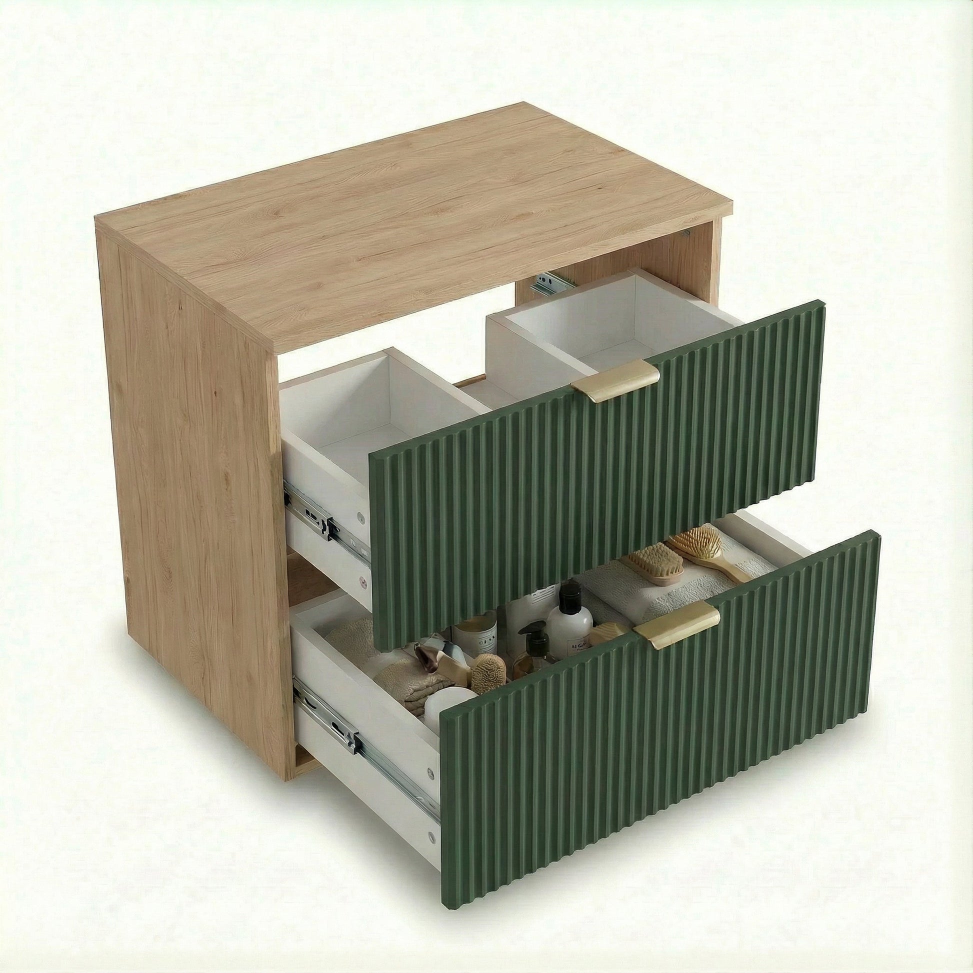 - Kolor: Szałwiowy – subtelny odcień zieleni, który wprowadza do wnętrza łazienki świeżość, harmonię i spokój, idealnie komponując się z naturalnym odcieniem orzecha, który znajduje się na blacie i regałach.
