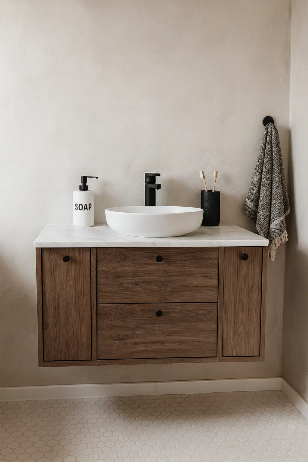 Zamknięte regały oferują praktyczne miejsce do przechowywania kosmetyków, ręczników i akcesoriów, umożliwiając utrzymanie porządku w łazience.