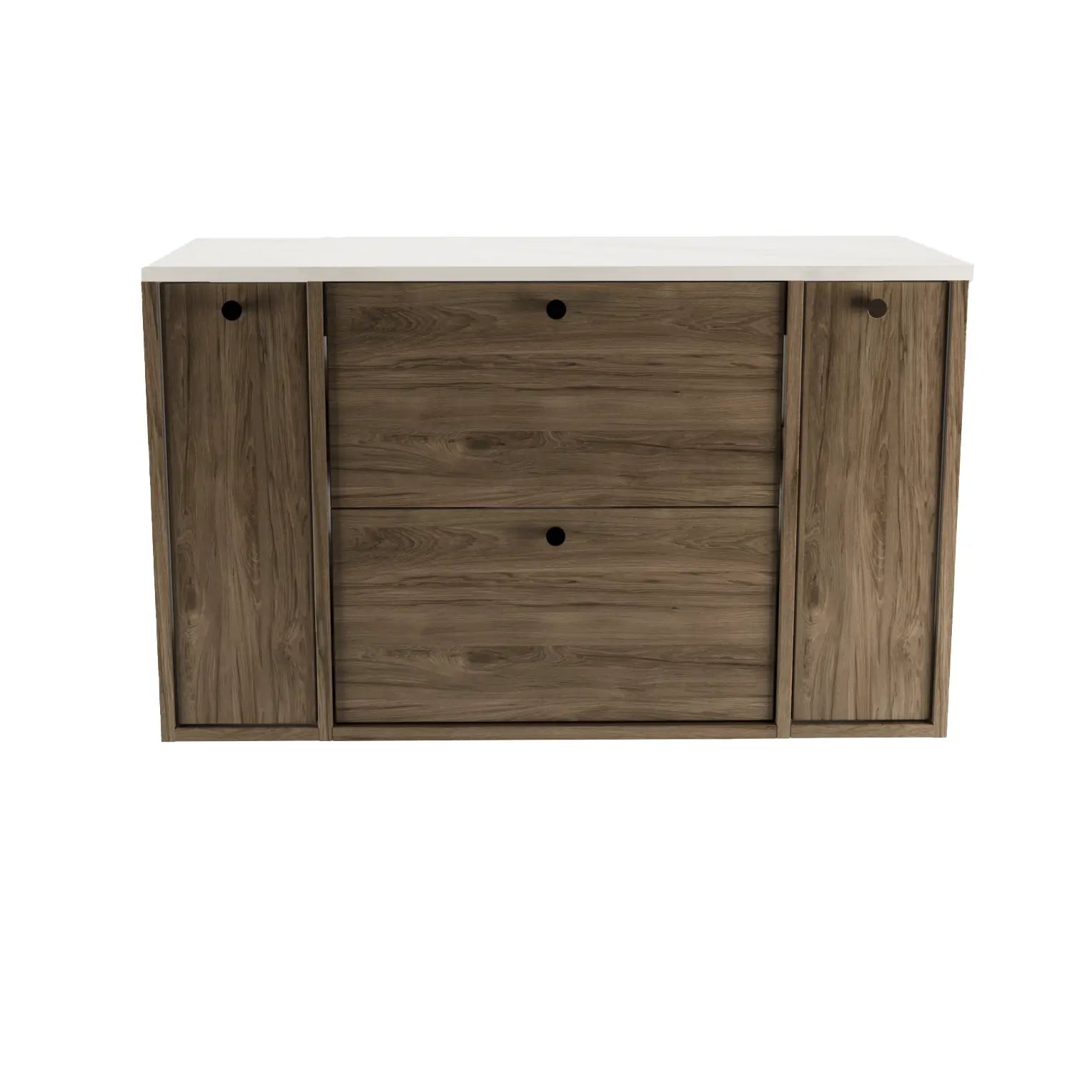 Mebel wykonany jest z płyty laminowanej 18 mm, zapewniającej trwałość i odporność na codzienne użytkowanie. Gładkie fronty oraz fronty cofnięte względem korpusu nadają bryle minimalistycznego, nowoczesnego charakteru. Dwie szuflady z systemem Soft-Close gwarantują ciche i wygodne domykanie.