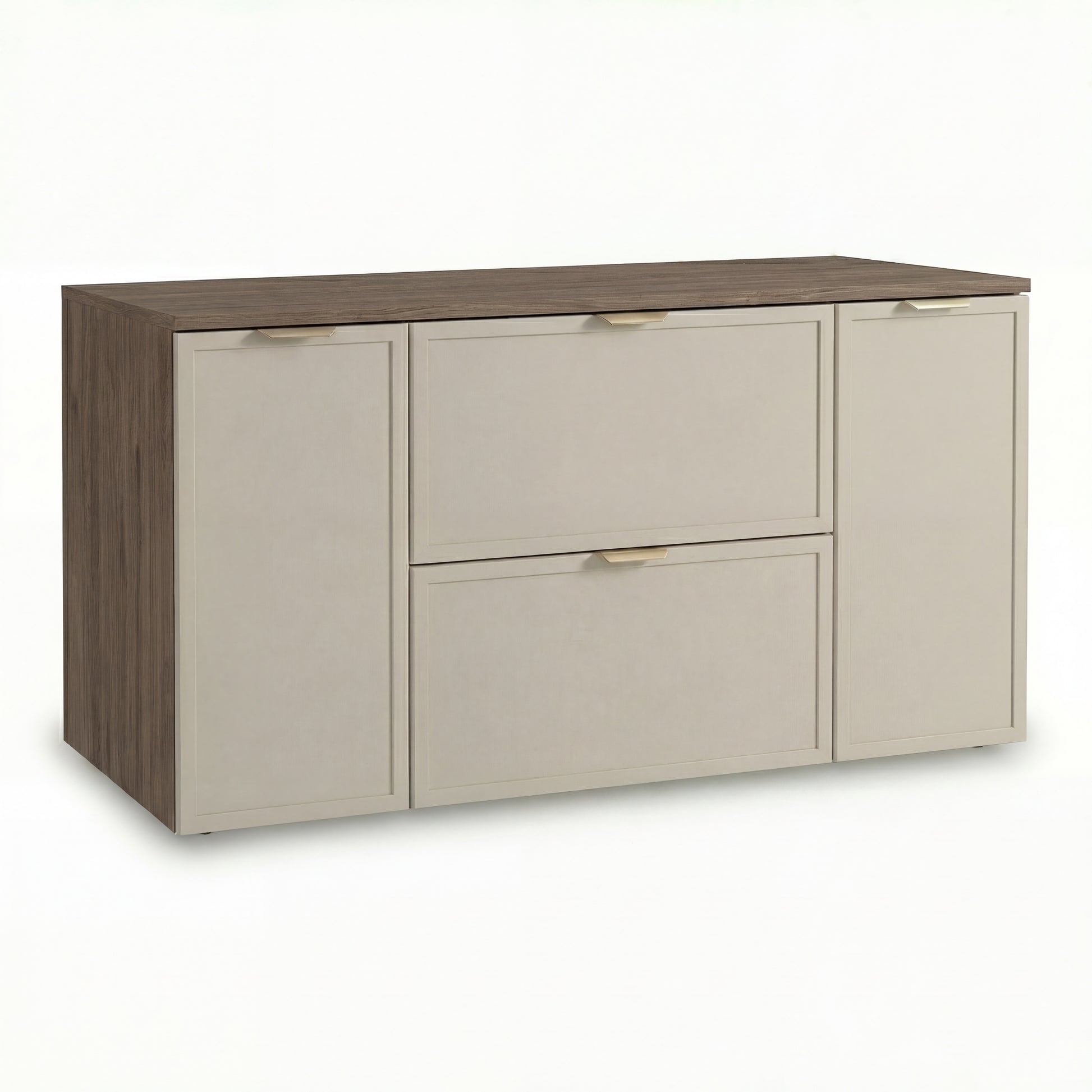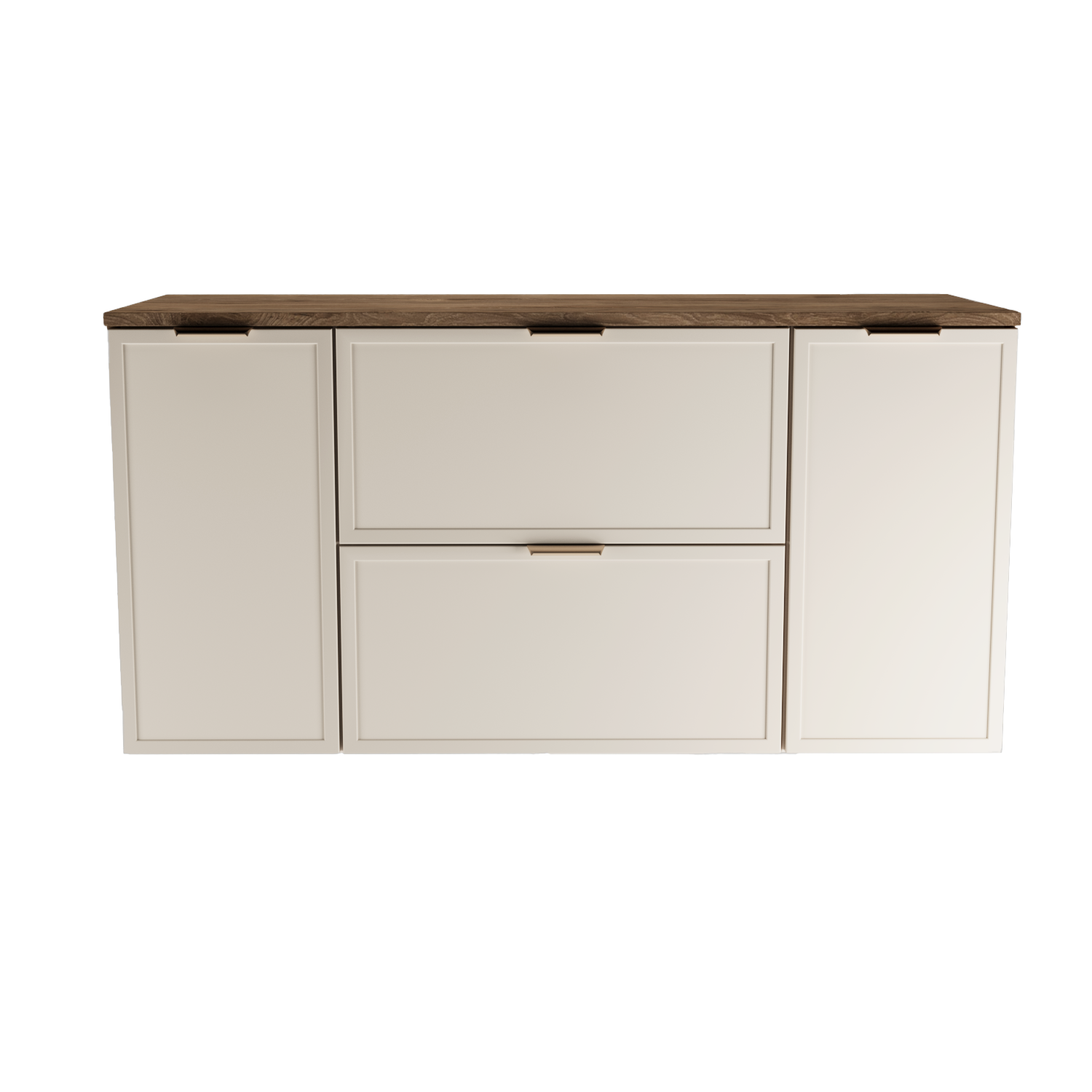Odporność i styl: Ciemny orzech na korpusach i blacie dodaje bryle ciężaru i elegancji, a kaszmirowe fronty rozświetlają całość.