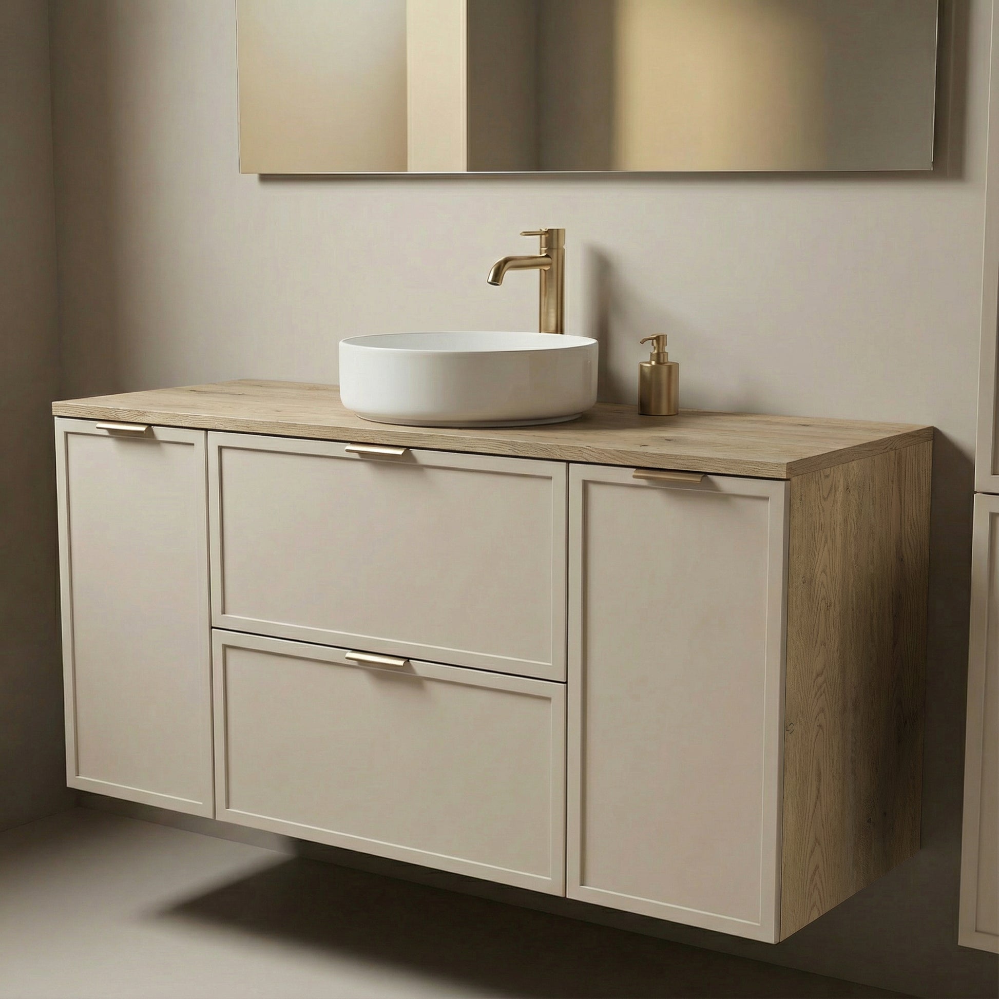 Zestaw mebli łazienkowych z kolekcji Roma o szerokości 120 cm. Model ten łączy matowe fronty w kolorze kaszmiru z korpusem oraz blatem w dekorze Dąb Cremona. Charakteryzuje się prostą formą wzbogaconą o dekoracyjne ramiaki na frontach.