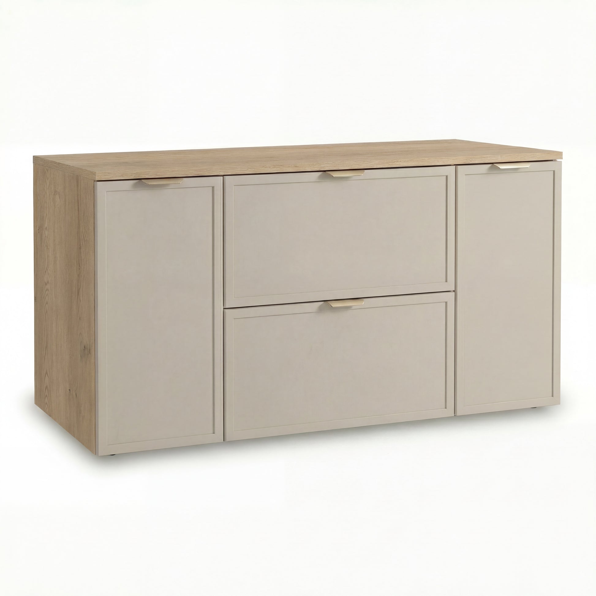 Kolorystyka: Zestawienie frontów w odcieniu kaszmiru (ciepły beż) z jasnym dębem Cremona o naturalnym rysunku drewna.
