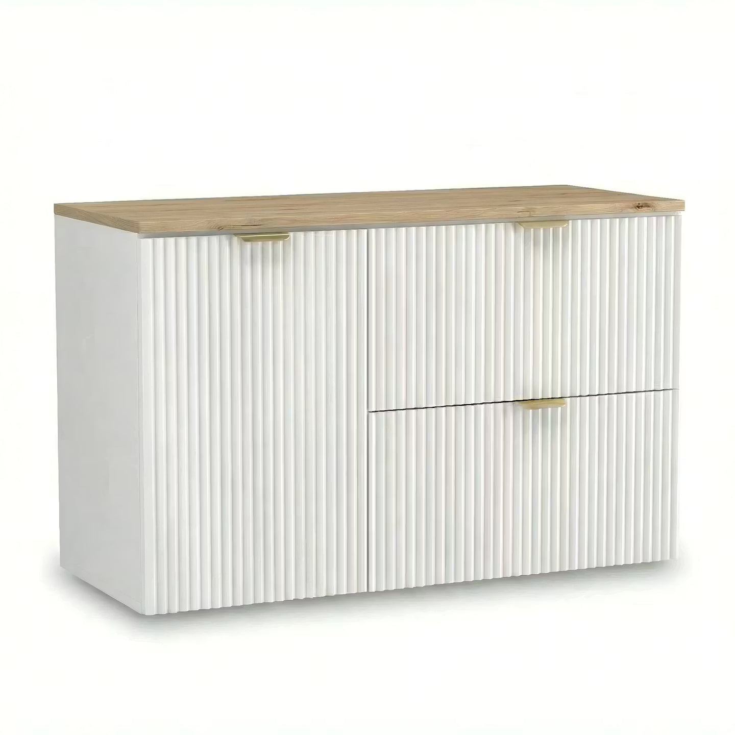 Oferujemy wyjątkową Szafkę pod umywalkę z koszem na pranie Białą z blatem Orzechowym Willy, która doskonale łączy elegancki design z funkcjonalnością. Idealna do nowoczesnych łazienek, wyróżnia się subtelnym, ale efektownym wyglądem. Została zaprojektowana z myślą o estetyce oraz komforcie użytkowania, a ryflowane fronty, złote metalowe uchwyty i solidna konstrukcja stanowią o jej wysokiej jakości.