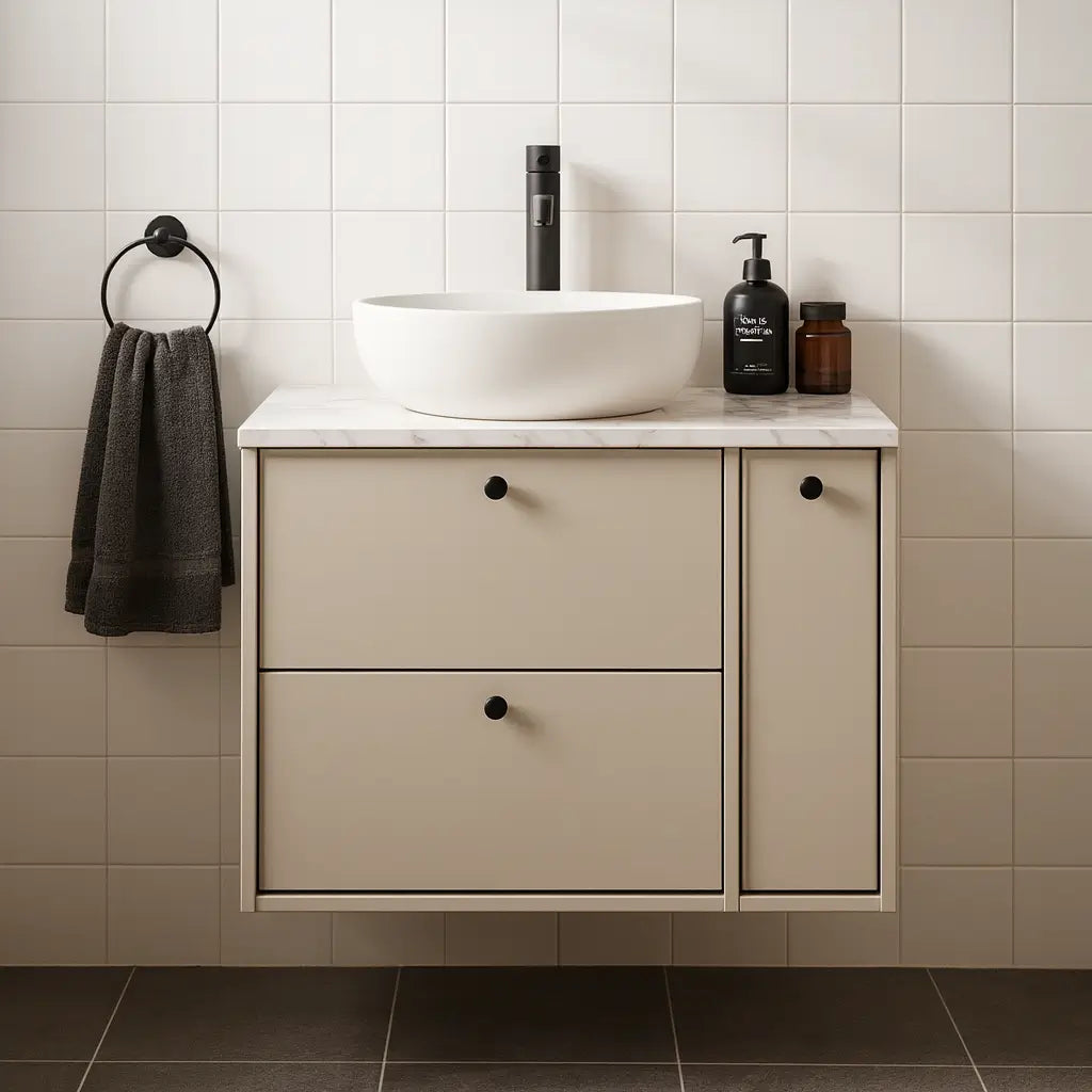 Belino 80 cm Kaszmir z blatem Marmur Bianco to mebel, który łączy nowoczesny design z funkcjonalnością, idealny do łazienek w stylu minimalistycznym, nowoczesnym oraz inspirowanym naturą.