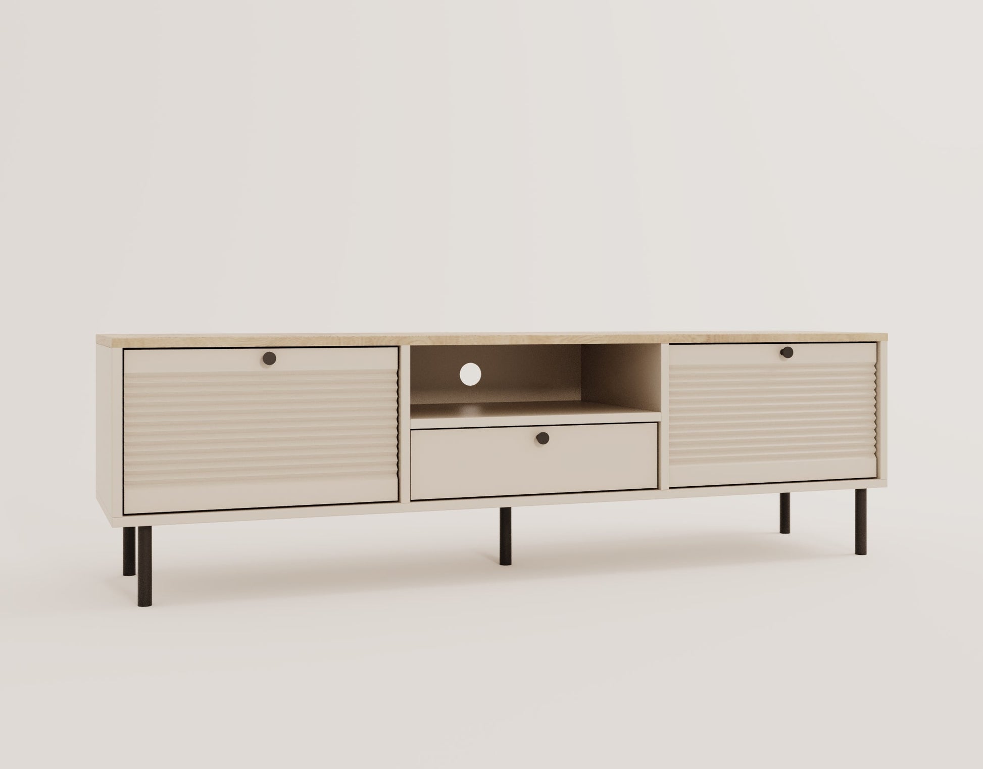 Szafka o szerokości idealnej do umieszczenia pod telewizorem (wielkość dostosowana do większości urządzeń RTV) oferuje praktyczne rozwiązania do przechowywania. Posiada 3 drzwi z ryflowanymi frontami, które umożliwiają schowanie sprzętu RTV.