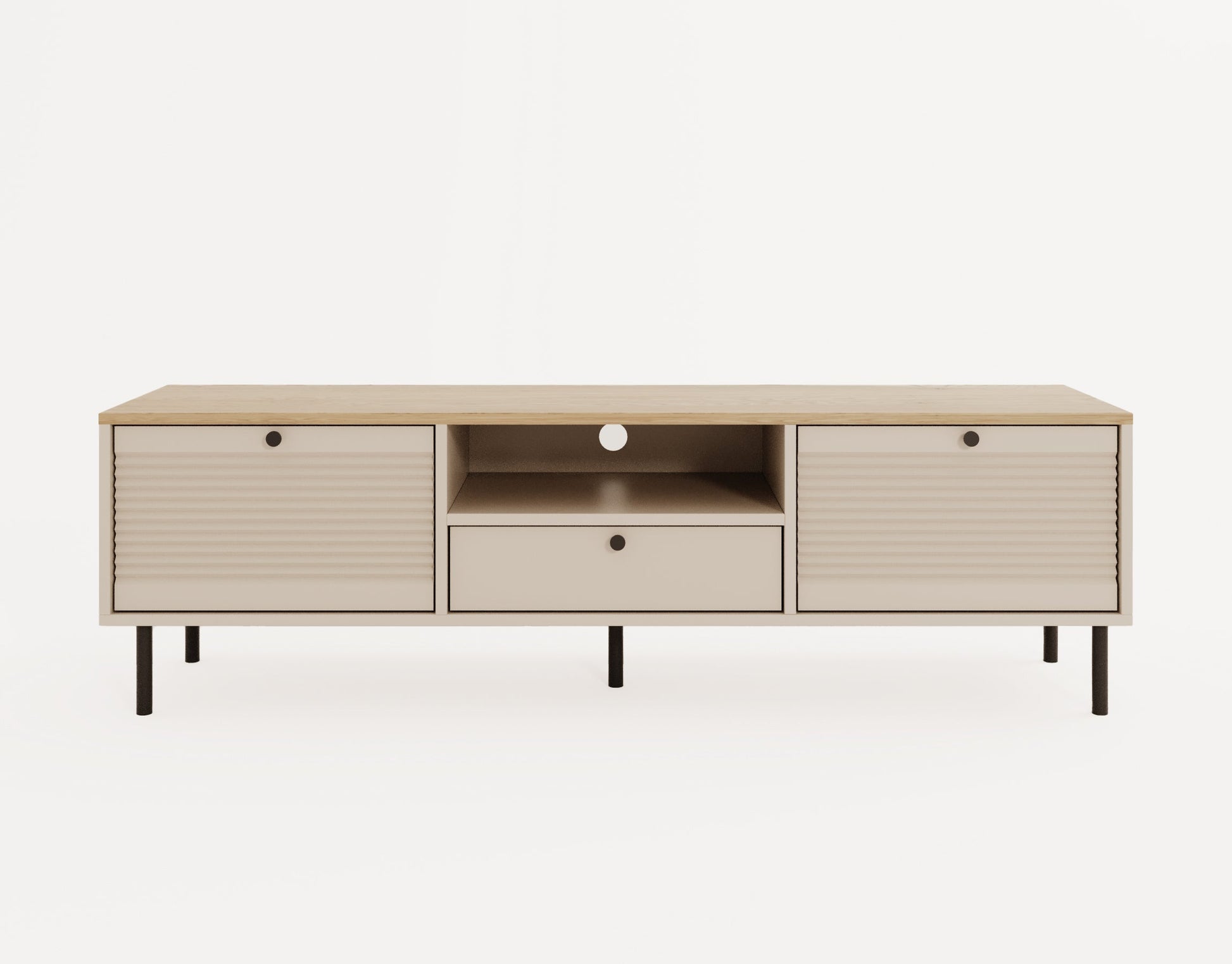 Szafka RTV wyróżnia się ryflowanymi frontami drzwi, które nadają meblowi unikalnego charakteru. Gładkie fronty szuflady w połączeniu z ryflowanymi drzwiami tworzą harmonijną całość, która pasuje do różnych aranżacji wnętrz. Mebel wykonany z płyty meblowej o grubości 18 mm zapewnia trwałość i solidność przez długie lata.